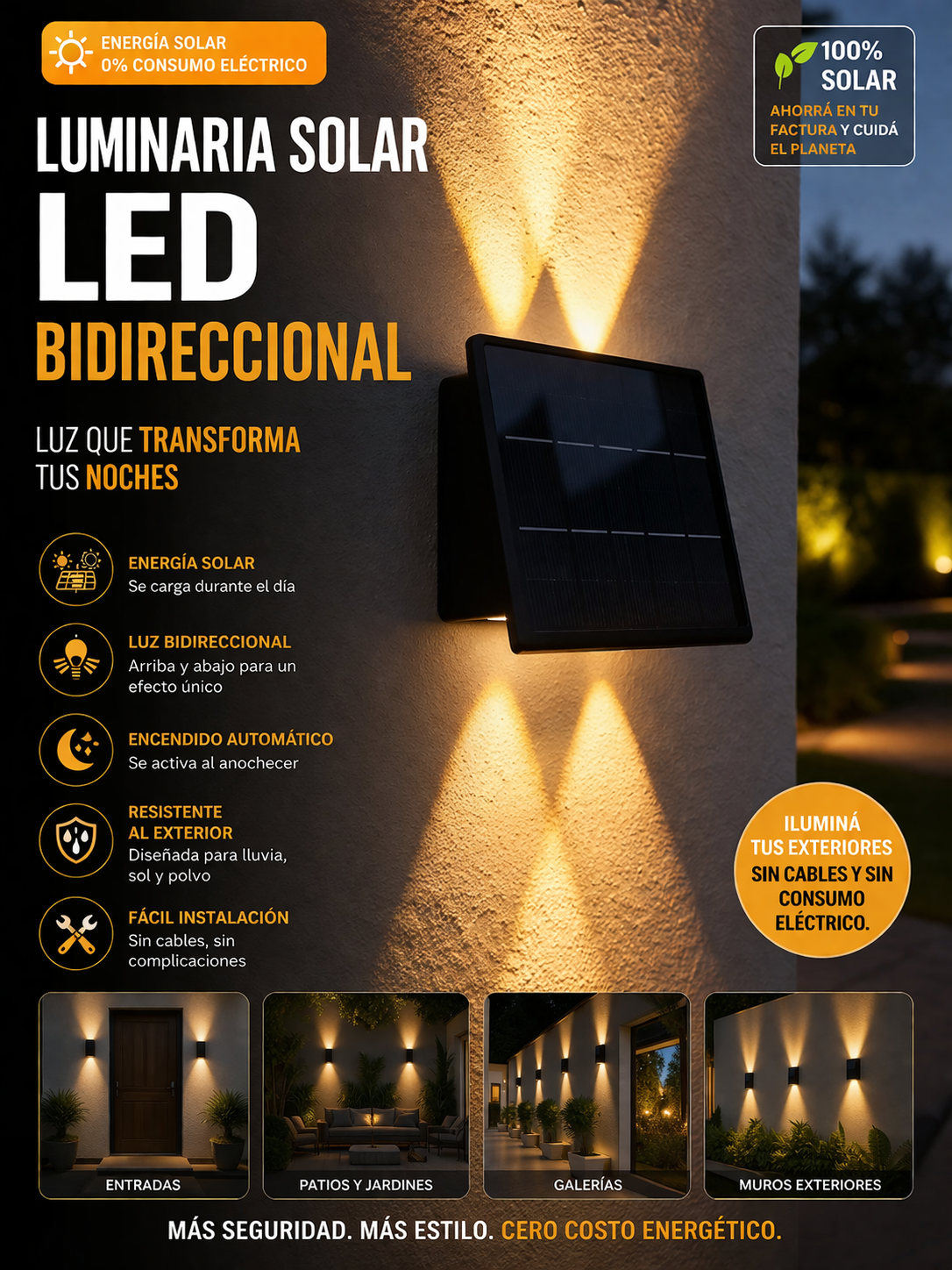 Iluminá tus espacios exteriores sin cables ni consumo eléctrico con esta luminaria solar LED bidireccional, diseñada para brindar estilo, seguridad y practicidad en un solo producto.