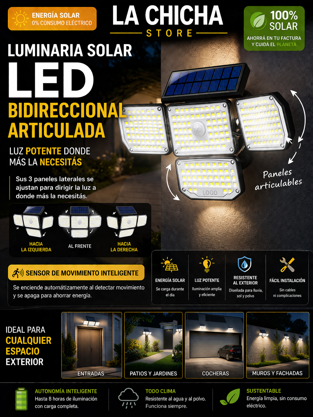 Gracias a sus 4 paneles LED articulados, podés dirigir la luz exactamente hacia donde la necesitás, logrando una cobertura mucho más amplia que una luminaria tradicional.